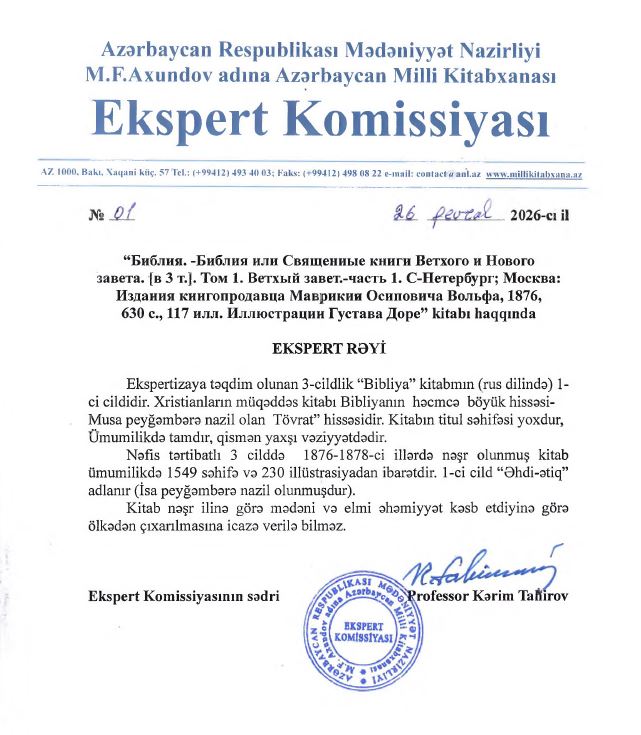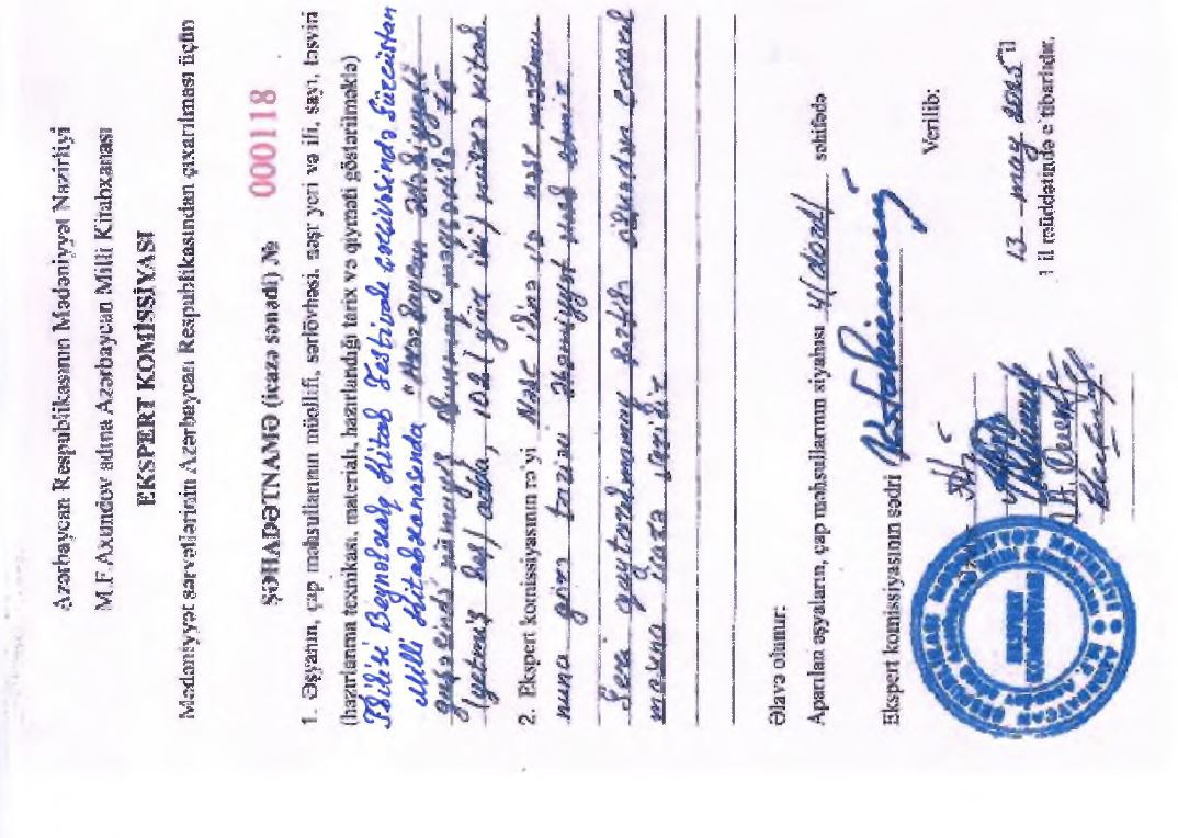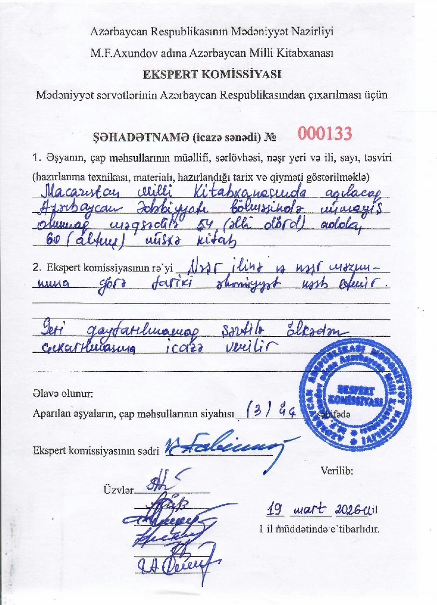 Azərbaycan Respublikası Mədəniyyət Nazirliyinin Kollegiyasının Qərarına (Protokol № 4/1, 10 iyun 2015) əsasən M.F. Axundov adına Azərbaycan Milli Kitabxanasının nəzdində çap məhsullarının, kitabların və əlyazmaların bədii və elmi dəyərinin müəyyənləşdirilməsi, xüsusi bədii ekspertiza keçirilməsi, mühafızə şəhadətnaməsinin verilməsi üzrə ekspert komissiyası fəaliyyət göstərir.