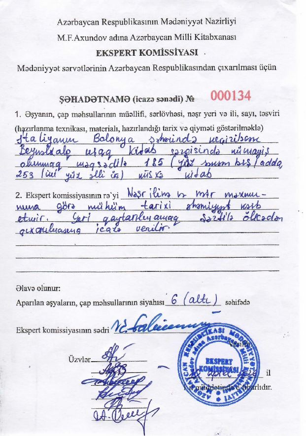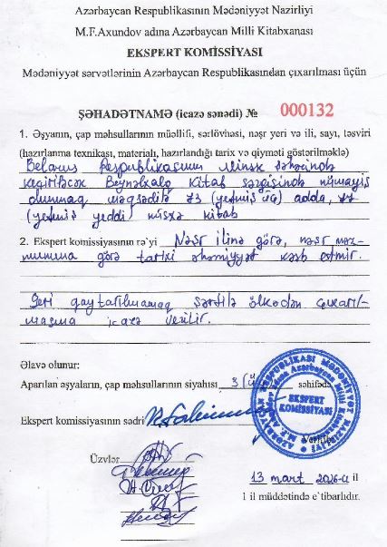 Respublikadan çıxarılmasına icazə verilmış çap məhsullarına, kitaba və əlyazmaya Mədəniyyət Nazirliyi tərəfindən təsdiq edilən forma üzrə nömrələnmiş ciddi hesabat blankı olan - şəhadətnamə (icazə sənədi) verilir. Respublikadan çıxarılan çap məhsullarının və nəşrlərin şəhadətnamələrinin (icazə sənədi) və siyahılarının bir nüsxəsi komissiyada qalır, iki nüsxəsi ərizəçiyə verilir (bir nüsxəsi gömrük orqanlarına təqdim olunmaq, digəri ərizəçidə qalmaq üçün).