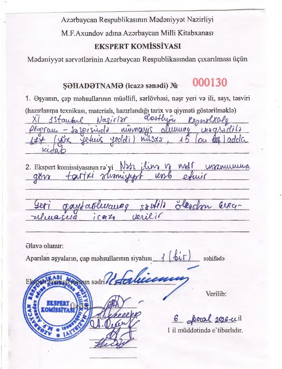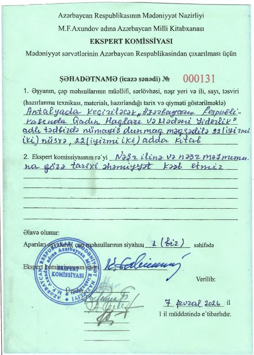 Çap məhsullarının, kitabların və əlyazmaların ekspertizasının keçirilməsi, tarixi, bədii, elmi dəyərinin müəyyənləşdirilməsi və respublikadan çıxarılması üçün şəhadətnamə (icazə sənədi) verilməsi üzrə ekspert komissiyanın Əsasnaməsi və tərkibi təsdiq edilmişdir.