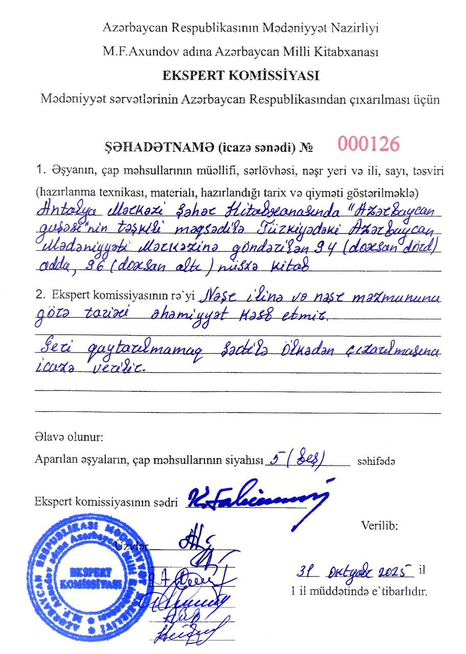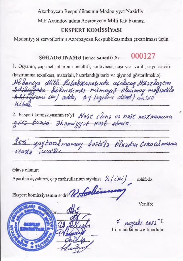 Azərbaycan Respublikası Mədəniyyət Nazirliyinin Kollegiyasının Qərarına (Protokol № 4/1, 10 iyun 2015) əsasən M.F. Axundov adına Azərbaycan Milli Kitabxanasının nəzdində çap məhsullarının, kitabların və əlyazmaların bədii və elmi dəyərinin müəyyənləşdirilməsi, xüsusi bədii ekspertiza keçirilməsi, mühafızə şəhadətnaməsinin verilməsi üzrə ekspert komissiyası fəaliyyət göstərir.
