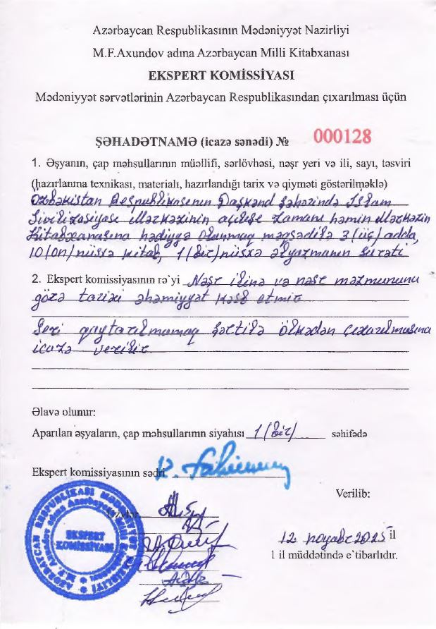 Çap məhsullarının, kitabların və əlyazmaların ekspertizasının keçirilməsi, tarixi, bədii, elmi dəyərinin müəyyənləşdirilməsi və respublikadan çıxarılması üçün şəhadətnamə (icazə sənədi) verilməsi üzrə ekspert komissiyanın Əsasnaməsi və tərkibi təsdiq edilmişdir.